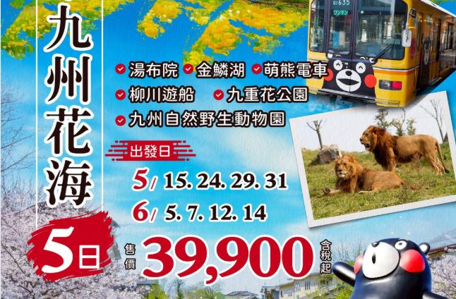 悠閒時光~玩樂九州花海5日~湯布院.九州自然野生動物園.柳川遊船.九重花公園.萌熊電車