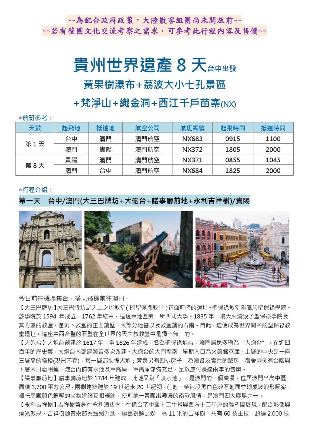 ★台中出發★ 貴州世界遺產 8天(自由行)