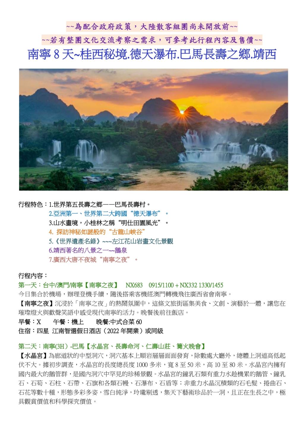 ★台中出發★ 南寧8天~桂西秘境.德天瀑布.巴馬.靖西8天(自由行) |